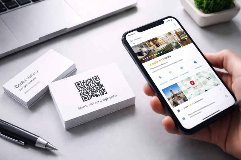 最も簡単で効果的な方法は、GoogleビジネスプロフィールのURLをQRコード化し、名刺に印刷することです。スマートフォンで読み取るだけで直接プロフィールページへ誘導できます。